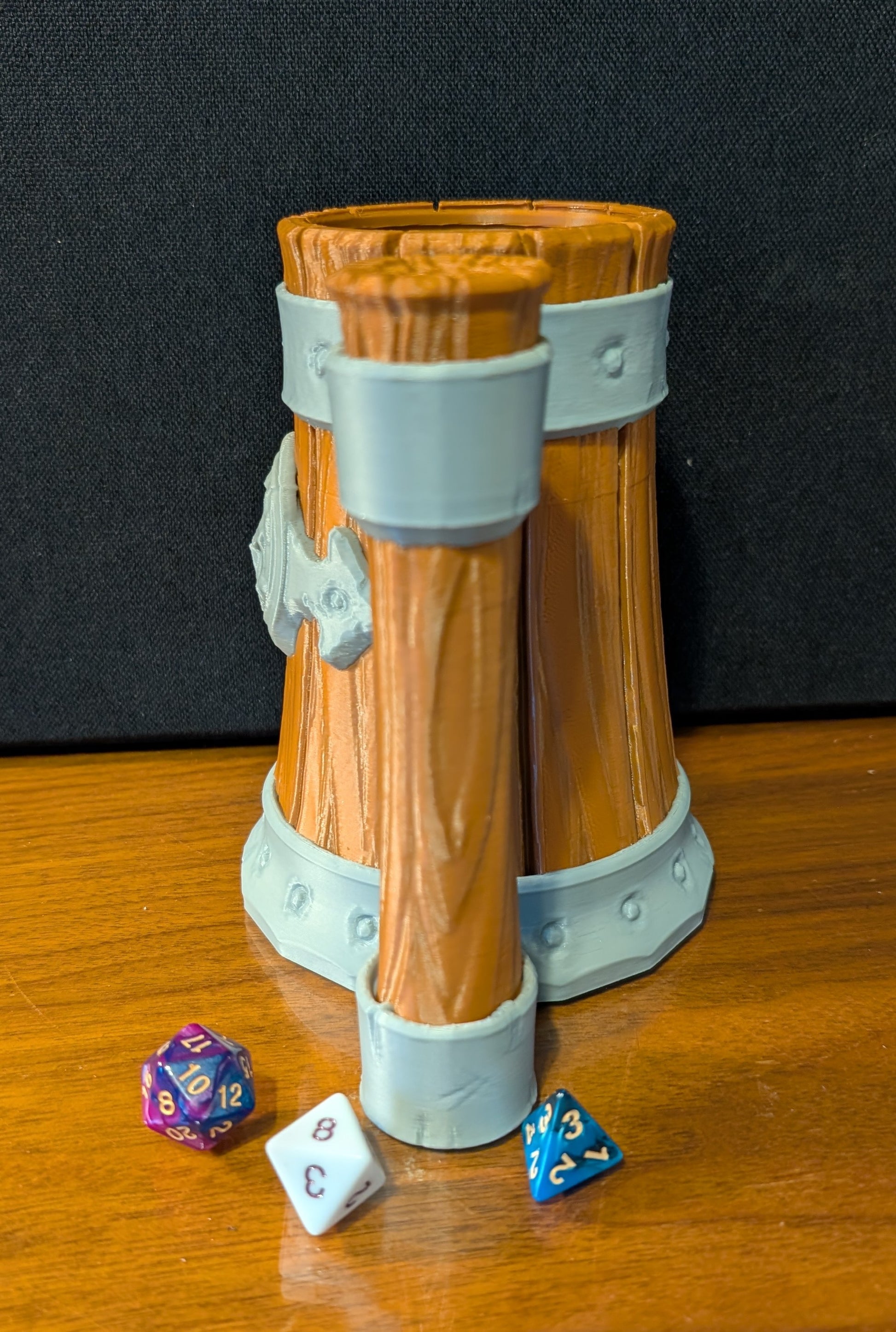 - The mug comes with matching lid, small dice box/spacers, and mini dice tower.